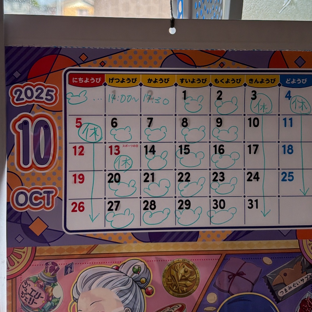 10月の営業日です。やっと過ごしやすい気温まで落ち着きました‼️土曜日も営業したほうがいいのかなぁ……と悩み中Ҩ(´-ω-`)御来店お待ちしております(*^^*)